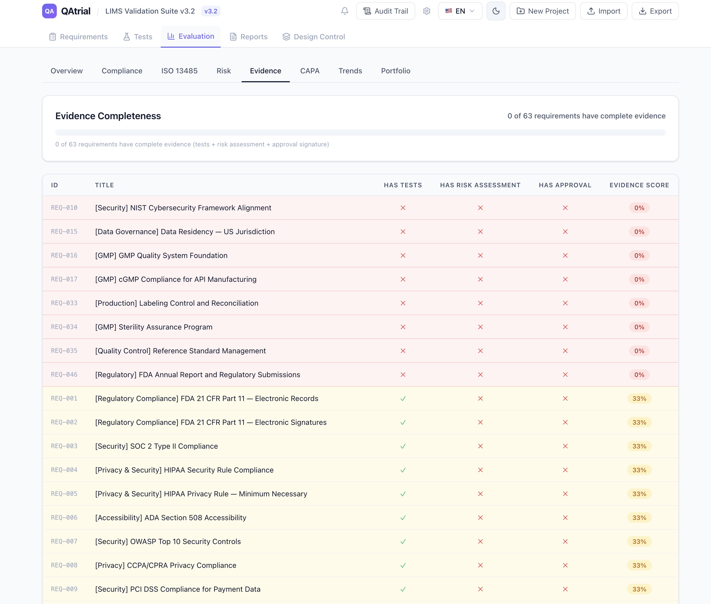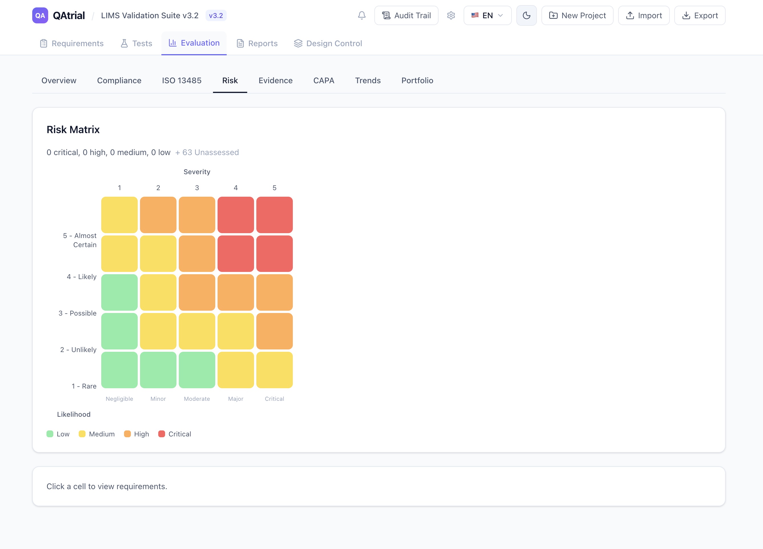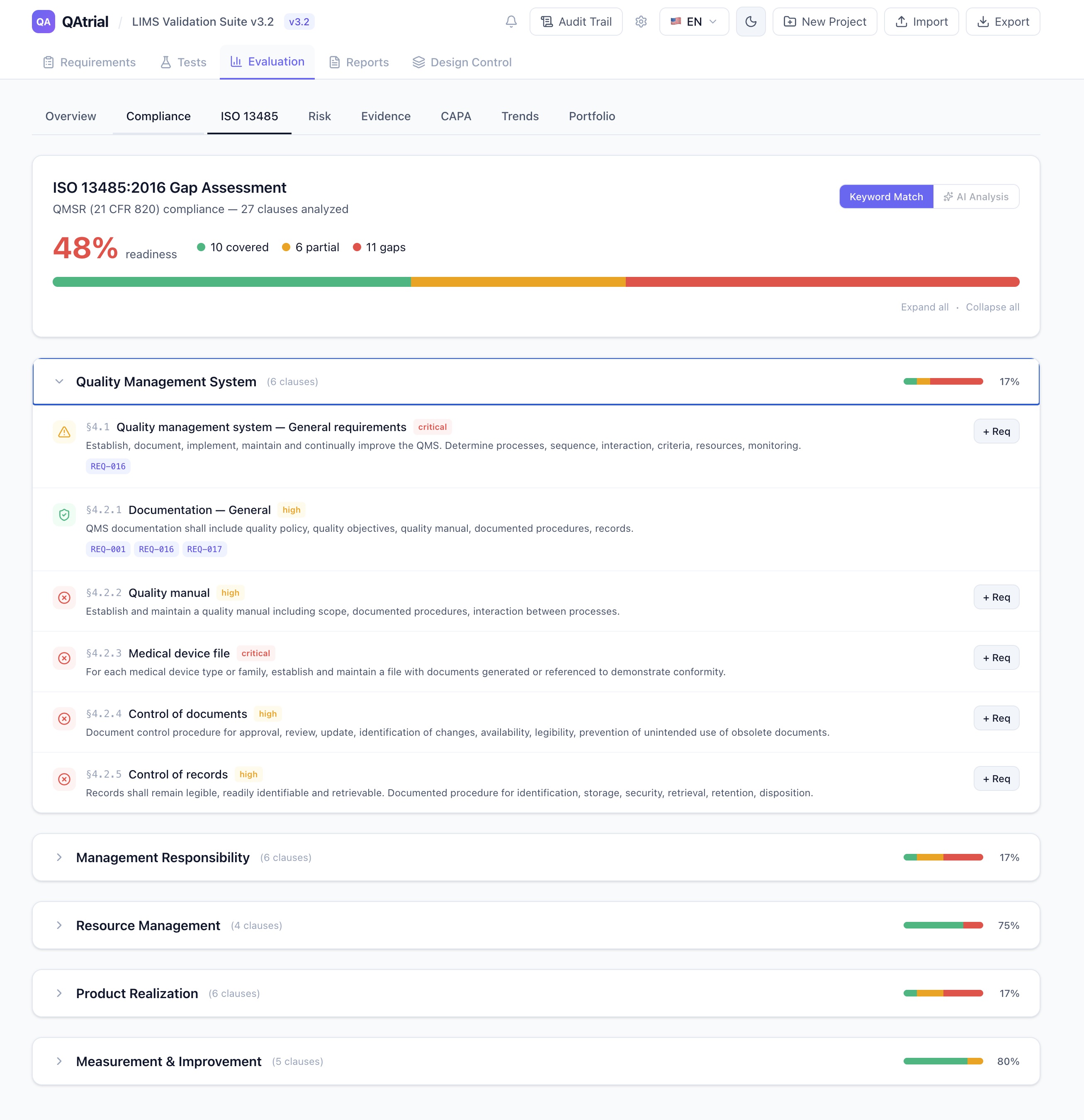 This is the headline feature. QAtrial now maps your project’s requirements against all 27 clauses of ISO 13485:2016 (sections 4 through 8) — exactly what QMSR requires.
