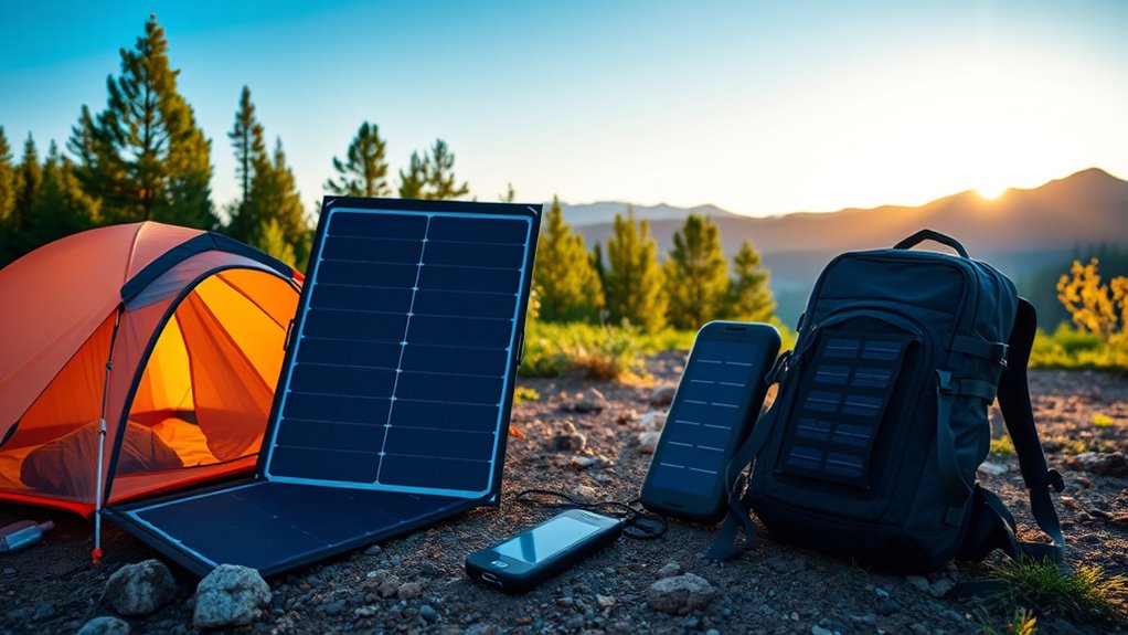 When choosing a solar charger for camping, I believe it’s not just about capacity or speed but trusting in nature’s own power. Like a theory that nature’s balance sustains us, a good solar charger reminds us that simplicity and harmony with the environment can keep us connected off-grid. So, pick one that aligns with your needs, and remember—sometimes, the best power source is the one that’s been waiting for you outside all along.