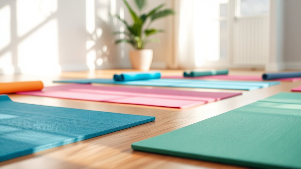 The right material can make all the difference in finding a yoga mat that supports your joints effectively. I always look for high-density foam or natural rubber, as these materials provide excellent cushioning while minimizing impact. It’s essential to choose eco-friendly options like TPE or PVC-free rubber, which are safer and free from harmful chemicals. I prefer mats with a closed-cell structure; they keep moisture out, reducing the risk of mold and bacteria. Durability is also a must—thicker mats can handle wear and tear better and offer long-lasting support. Finally, while I won’t explore non-slip surfaces just yet, I can’t stress enough how important it is for stability, especially when dealing with joint concerns.